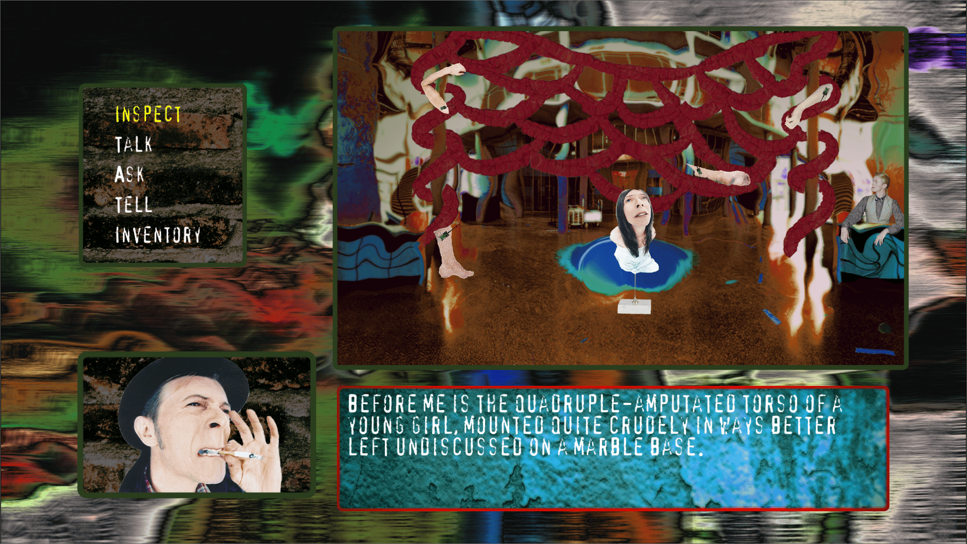 "The Interactive Diary of Nathan Adler" is an expanded interactive adaptation of David Bowie's 1995 album '1. Outside". It is intended to evoke what such a game might have been like, had it been produced contemporaneously with the album.